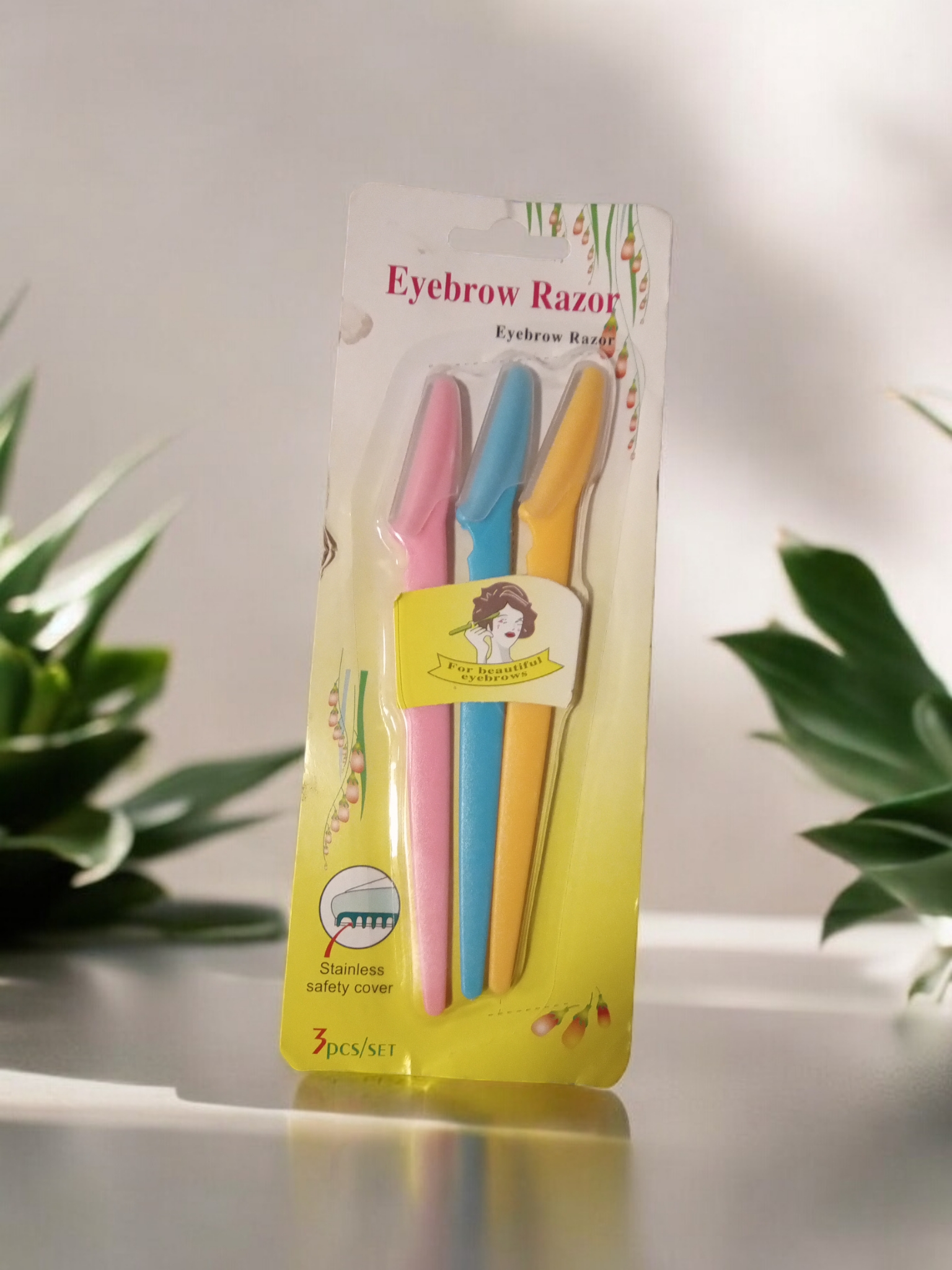 Eyebrow razor , stainless safety cover. Three different colors in one pack.